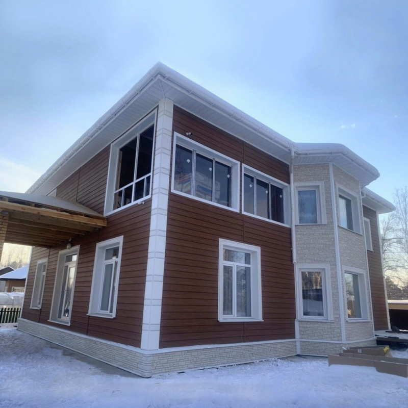 Фасадные панели могут использоваться как для оформления фасада целиком, так и для облицовки фундамента, выделения отдельных деталей.