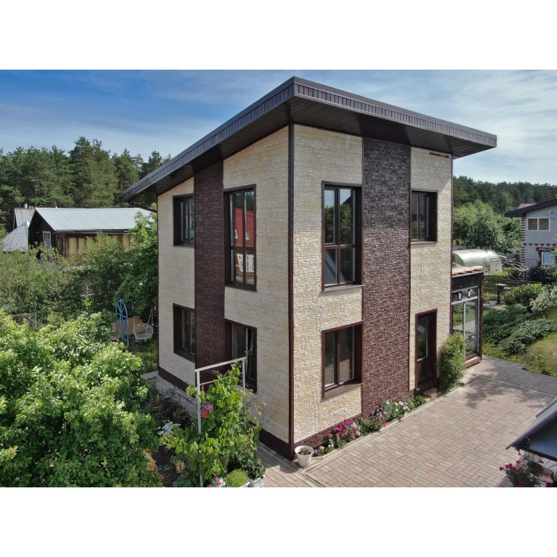 Фасадные панели могут использоваться как для оформления фасада целиком, так и для облицовки фундамента, выделения отдельных деталей.