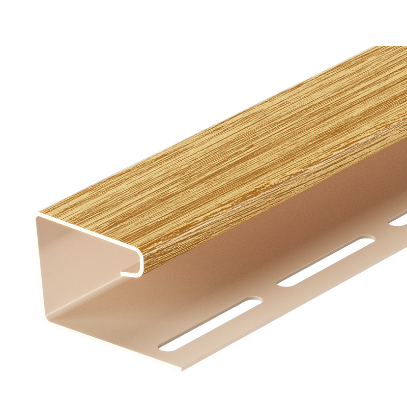 Виниловый J-профиль под дерево серии LUX от Docke длиной 3 м, цвет Зрелый каштан. Используется для оформления мест стыков крыши и фронтона, при отделке оконных и дверных проемов, в качестве приемного профиля для софитов, а также как декоративный и защитный угловой элемент.