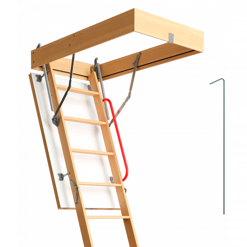 Лестница Docke PREMIUM устанавливается в потолочный проем 70x120 см и подходит для помещений с высотой потолков до 3-х метров. В комплект поставки входит металлическая фурнитура, запорный замок, ручка - ключ. При необходимости дополнительно можно приобрести поручни и наконечники на ножки.