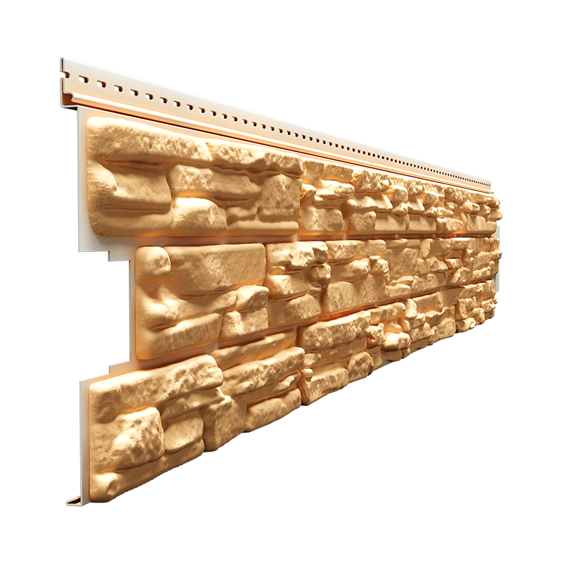 Виниловая фасадная панель с текстурой слоистого песчаника из коллекции ROCKY премиальной дизайнерской серии LUX от Деке. Панель имитирует фактуру слоистого песчаника с глубоким ярко выраженным рельефом, что позволяет ей выразительно смотреться на фасаде.