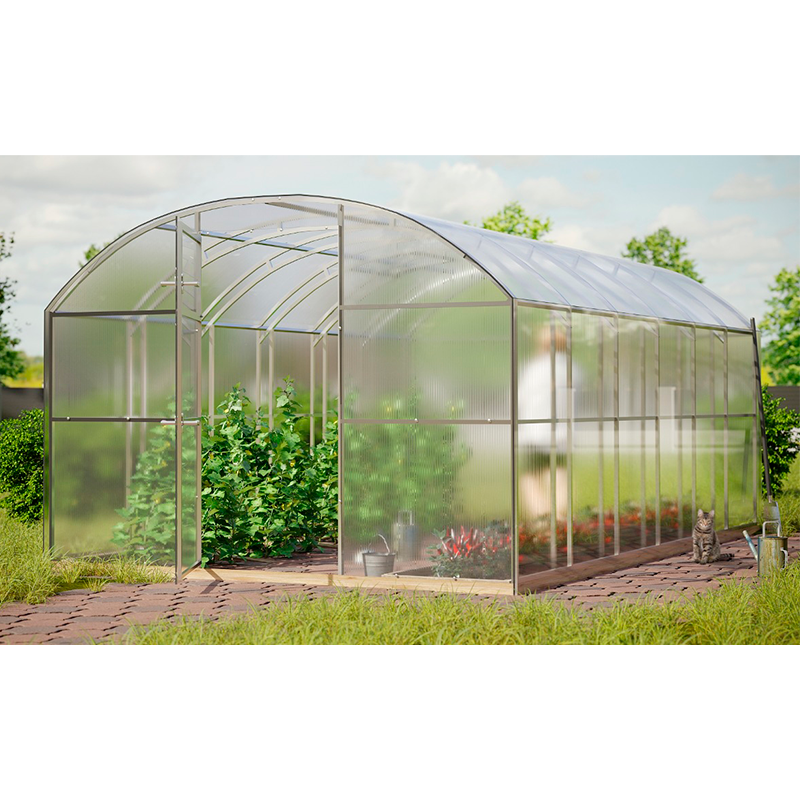 Каркас теплицы изготовлен из оцинкованной профильной трубы сечением 25х25 мм с толщиной стенки 1,2 мм. Цельносварные дуги-фермы придают дополнительную прочность каркасу, дверь и форточка уже приварены и не требуют дополнительного монтажа.